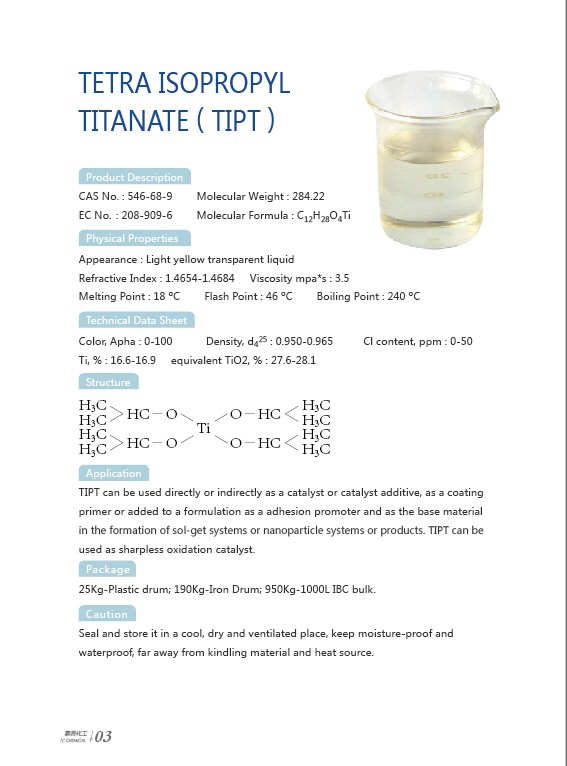 1. TIPT can be used directly or in directly as a catalyst or catlyst additive,as a coating primer or added to formulation as a adhesion promoter and as the base material in the formation fo sol-get systems or nanoparticle systems or products.